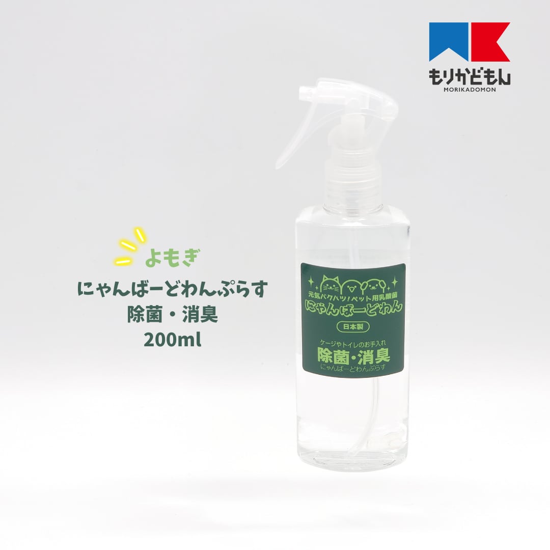 にゃんばーどわんぷらす(200ml)は、天然成分100%のヨモギ由来乳酸菌液を使用したペット用除菌消臭スプレーです。お子様やペットがいるご家庭でも安心してご利用いただけます。常に清潔で快適な空間を提供することができます。